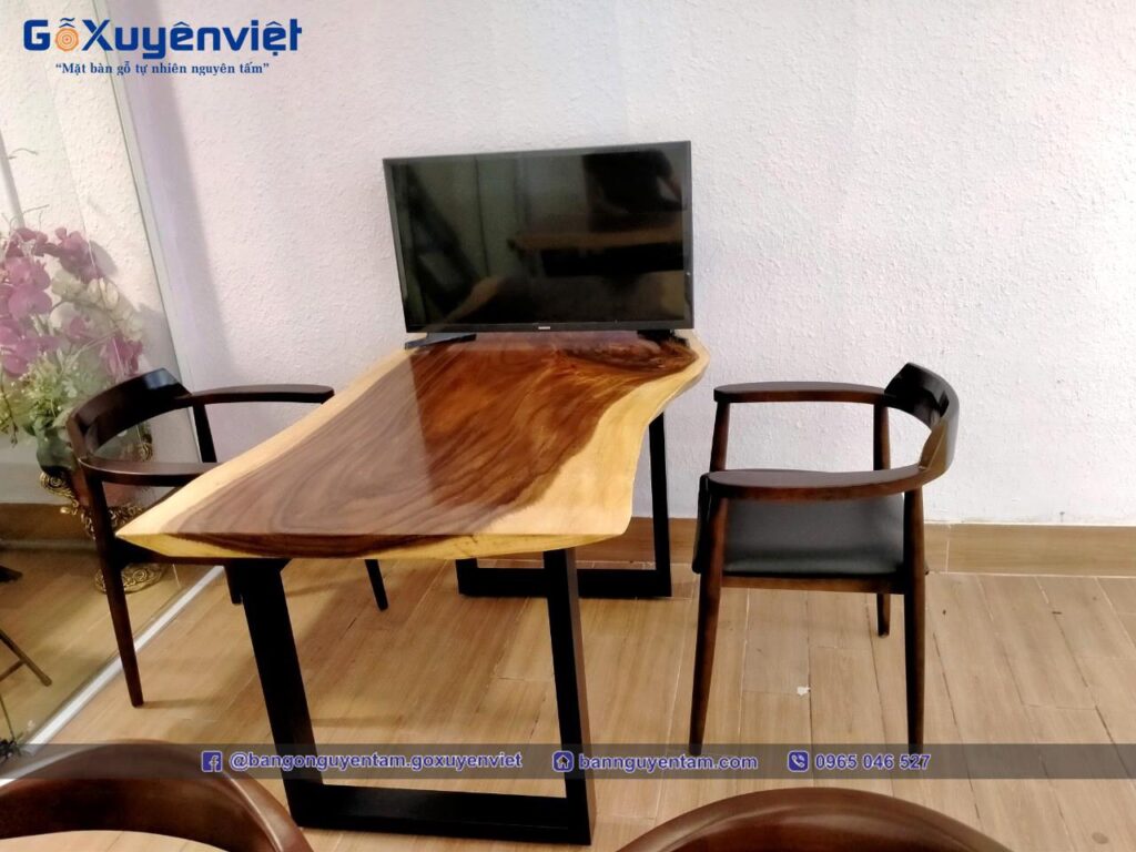 Việc thay thế những bàn ghế văn phòng thông thường bằng bàn ghế gỗ me tây là sự phá cách phù hợp xu thế hiện đại. Sự mới mẻ vẻ đẹp gỗ me tây giúp bạn khắc phục sự nhàm chán với kiểu nội thất vốn có. Bàn làm việc với mặt bàn gỗ nguyên tấm tự nhiên,  mặt gỗ sáng mịn, chắc  chắn. Với kiểu dáng độc đáo, không theo khuôn mẫu định sẵn nào. Nỗi bật hơn hết là đường vân, màu sắc nâu socola tự nhiên ấn tượng.