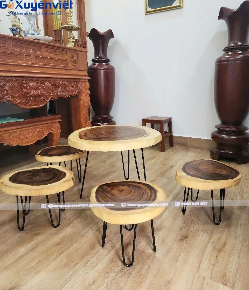 Sự kết hợp giữa gỗ me tây và chân sắt hiện đại tạo nên một mẫu ghế phá cách, phù hợp với không gian năng động.